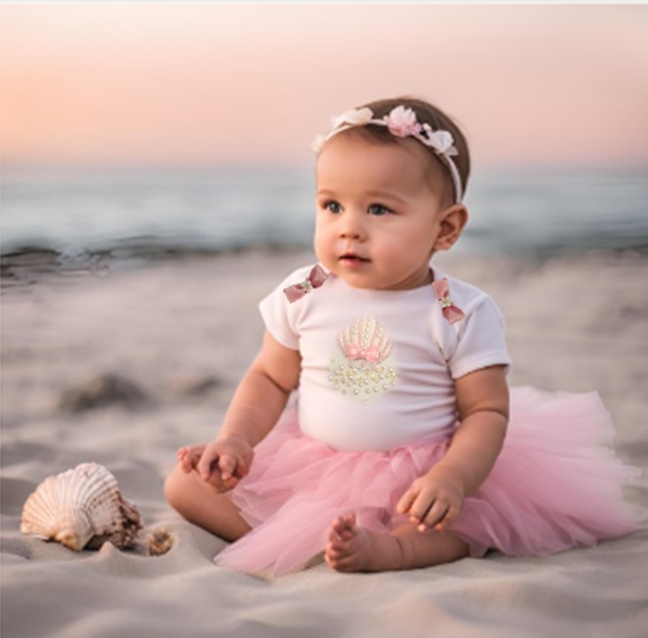 Body personalizado de bebê com estampa de conchinha, delicadamente bordado à mão com pérolas e laços.
